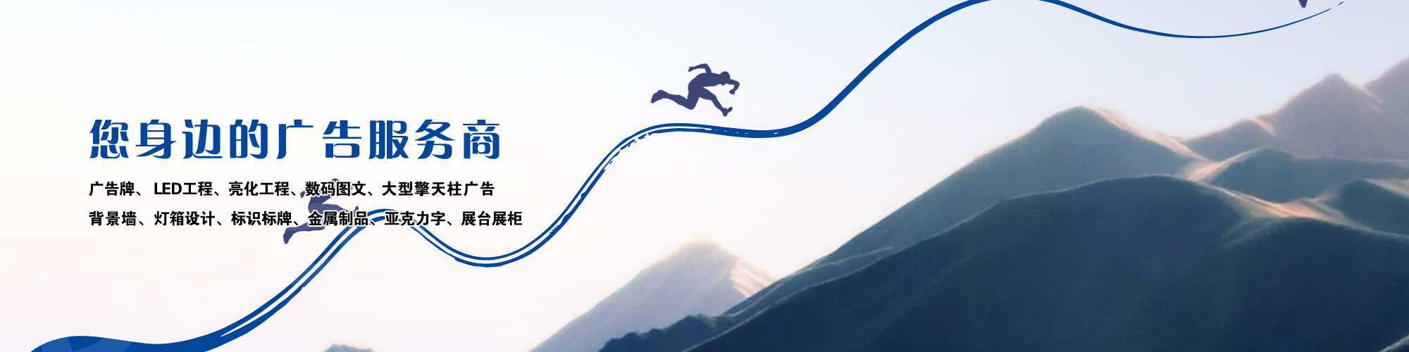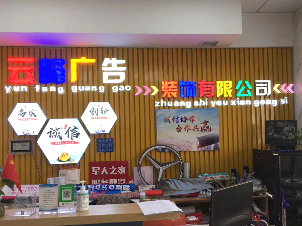 葫蘆島市云峰廣告裝飾有限公司自創立以來,一直致力于廣告牌的設計,噴繪,制作,安裝、LED工程、亮化工程、數碼圖文、圍擋制作安裝、三面翻廣告、大型擎天柱廣告、草坪牌、指示牌、雕刻背景墻、燈箱設計、標識標牌、金屬制品、亞克力字、展臺展柜、取款機隔斷、取款機隔斷等一體化服務,是葫蘆島市噴繪行業大規模實業公司。
